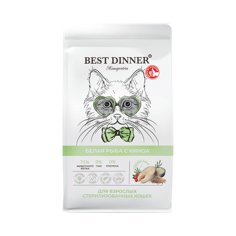 Best Dinner Монопротеин Белая рыба с Киноа разработан специально для стерилизованных и кастрированных кошек, страдающих от аллергии и проблем с пищеварением. Основу рациона составляет белая рыба - этот легкоусвояемый источник белка идеально подходит для кошек с чувствительным пищеварением. Белая рыба богата Омега-3 жирными кислотами, необходимыми для здоровья кожи и шерсти.