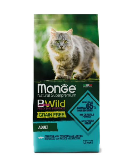 Monge (Монж) Cat BWild GRAIN FREE (холистик) полнорационный беззерновой корм из трески, картофеля и чечевицы для взрослых кошек и котов 1,5 кг.