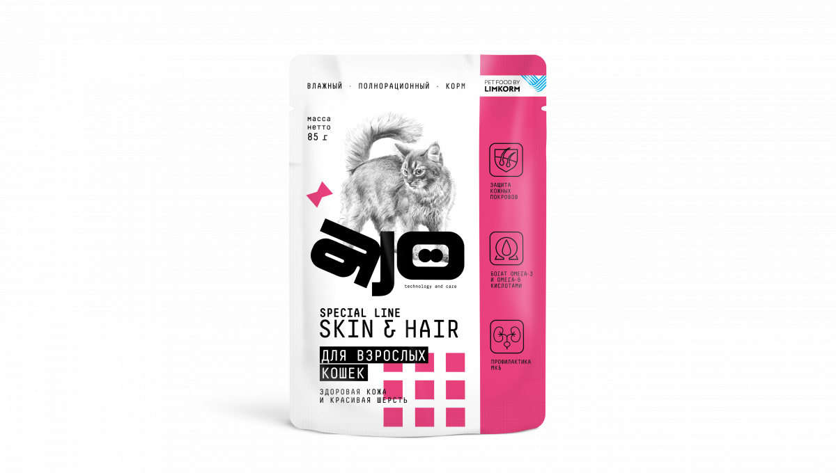 мясо и мясные субпродукты в кусочках не менее 74 % (курица 44%, свинина 30%), рыба лососевых пород 6%, рисовый белок, мука пшеничная, подсолнечное масло, альбумин, гидролизат куриного белка, растительная клетчатка, жир лососевый, пивные дрожжи, витаминно-минеральный комплекс, таурин, экстракт юкки, натуральные загустители