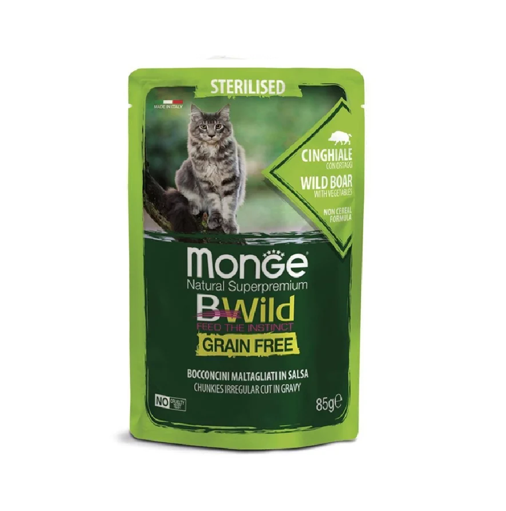 Monge Cat BWild Grain Free паучи из мяса кабана с овощами (зеленая фасоль и морковь) для стерилизованных кошек – это полноценное сбалансированное питание для стерилизованных кошек.