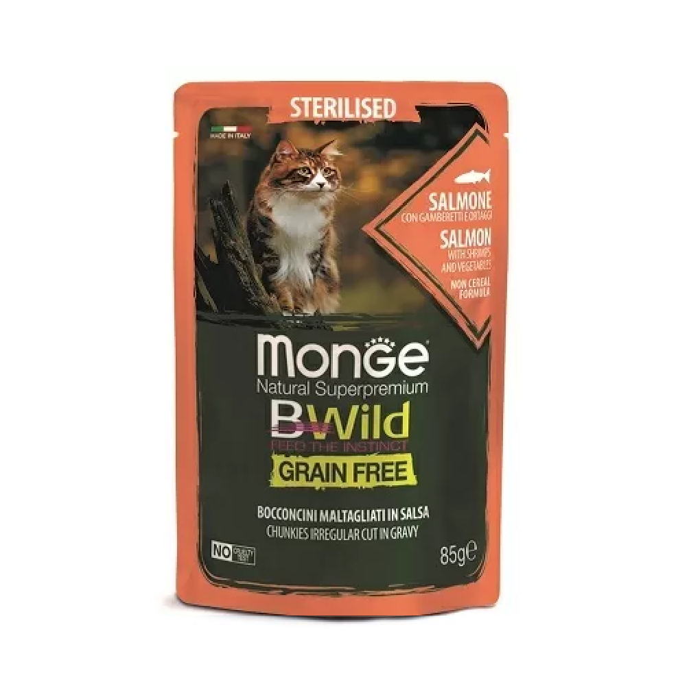 Monge Cat BWild Grain Free паучи из лосося с креветками и овощами (зеленая фасоль и морковь) для стерилизованных кошек – это полноценное сбалансированное питание для взрослых стерилизованных кошек.
