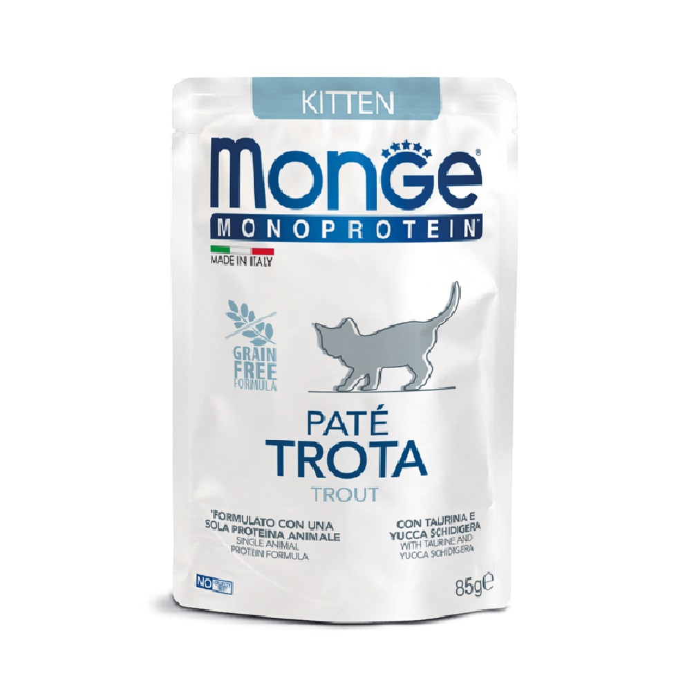 Monge Monoprotein Trota - паучи для котят форель - это полноценный сбалансированный рацион из форели для котят от 2 месяцев. В состав паштета входят один источник белка животного происхождения и один источник углеводов, такой как картофель.