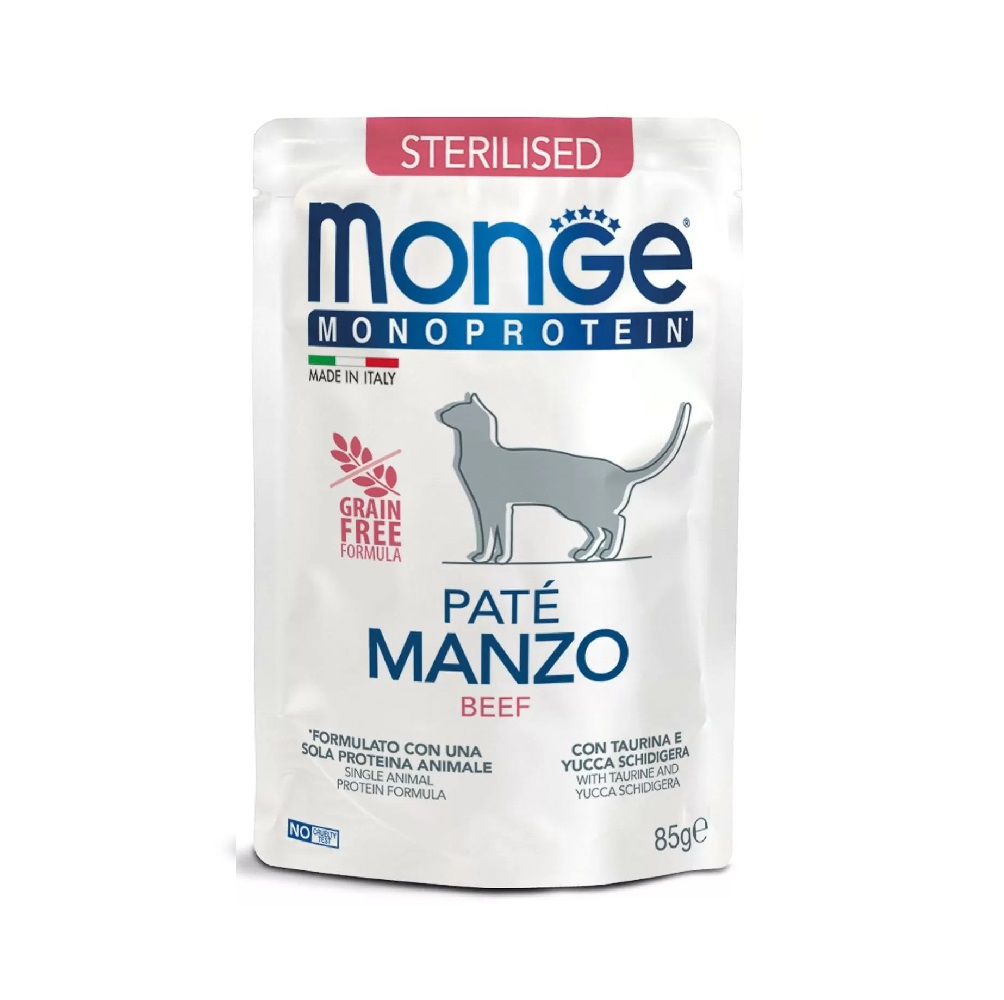 Monge Monoprotein Manzo - паучи для стерилизованных кошек с говядиной - это полноценный сбалансированный рацион из мяса говядины для стерилизованных кошек с особыми потребностями. В состав паштета входят один источник белка животного происхождения и один источник углеводов, такой как картофель.