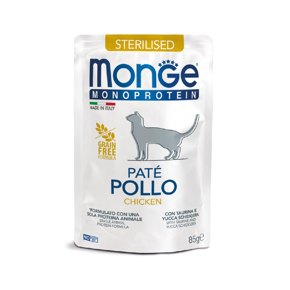 Monge Monoprotein Pollo - паучи для стерилизованных кошек с курицей - это полноценный сбалансированный рацион из мяса курицы для стерилизованных кошек с особыми потребностями. В состав паштета входят один источник белка животного происхождения и один источник углеводов, такой как картофель.