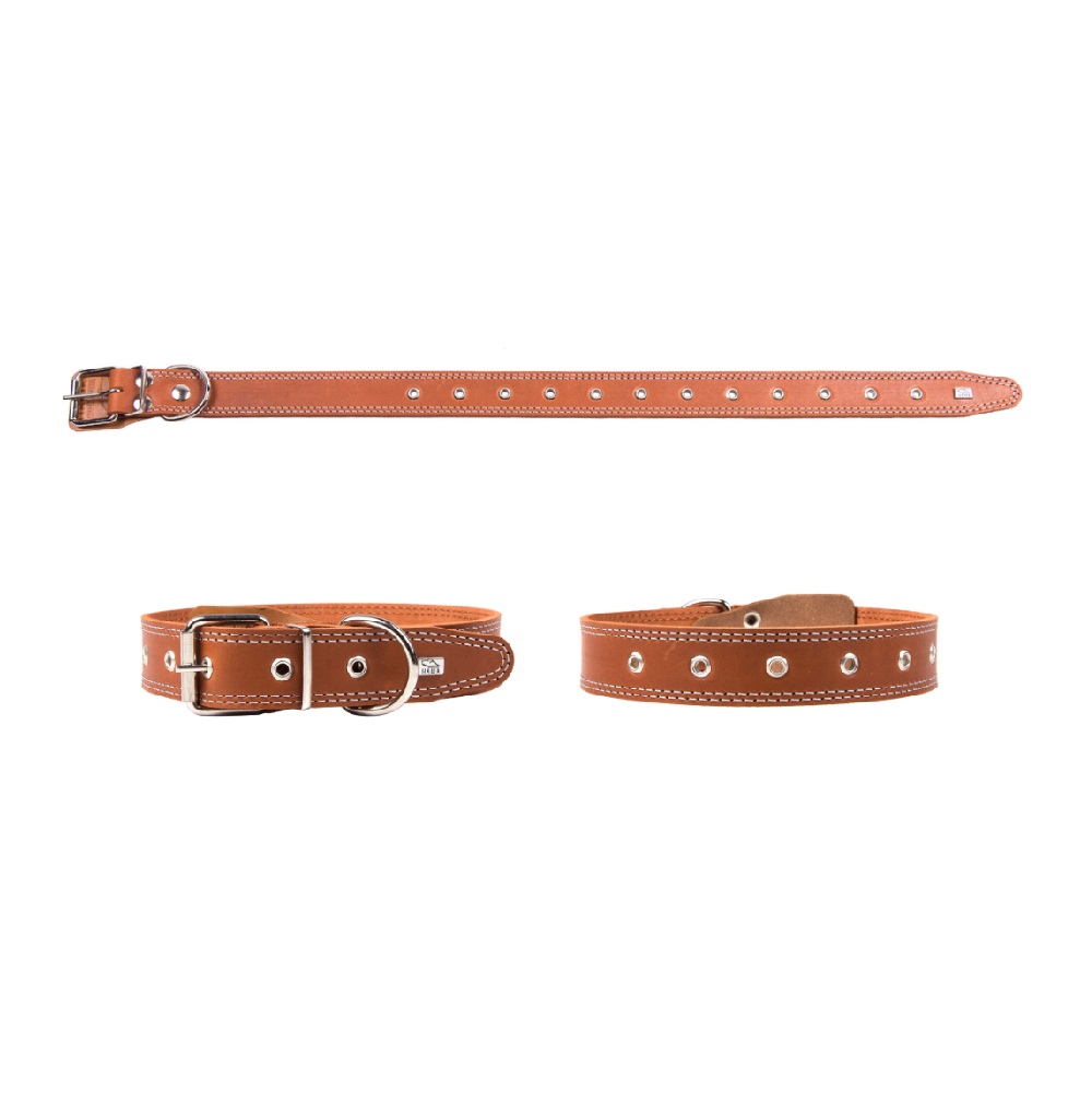 Однослойный ошейник из натуральной кожи, прошит декоративной строчкой, отверстия укреплены металлической блочкой, полукольцо у пряжки.