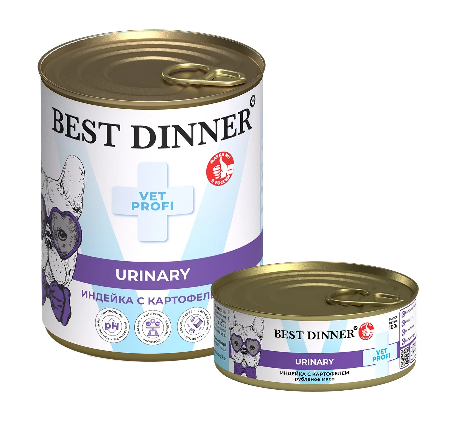 Влажный консервированный функциональный корм для собак и щенков с 6 мес с профилактикой мочекаменной болезни Рецептура создана на основе мяса индейки, богатого не только необходимыми аминокислотами, но и Омега-3, стимулирующими работу головного мозга. Для профилактики и лечения рецидивов МКБ используется DL-метионин. DL-метионин -серосодержащая аминокислота, которая выравнивает PH мочи. Инулин – природный пребиотик, стимулирующий выработку полезных микроорганизмов. Дрожжи - источник антиоксидантов, укрепляющих иммунитет. Позаботьтесь о здоровье любимца вместе с Best Dinner! Состав: Индейка, мясные субпродукты, плазма крови, картофельный крахмал, яичный порошок, клетчатка, отруби пшеничные, масло льняное, рыбий жир, дрожжи, морские водоросли, топинамбур, семена льна, юкка шидигера, желе, DL-метионин. Аналитический состав: сырой протеин – 8,5; сырой жир– 65; углеводы – 1,5; сырая зола– 2,0; сырая клетчатка –0,5, влага, - 84,0 Добавки: витамины, МЕ: А – 8000,0, Д &nda