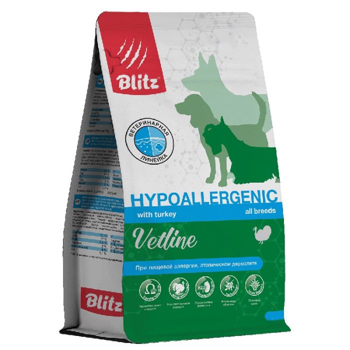 Выпадение шерсти, расчёсы на коже, покраснение ушей, воспаление слизистых глаз и дёсен — характерные проявления аллергии у собак. Поддержать здоровье питомцев и снизить раздражающие признаки атопического дерматита и пищевой аллергии призван диетический сухой корм Blitz Hypoallergenic. Он разработан согласно рекомендациям врачей и диетологов и учитывает не только потребности собак в питательных веществах, но и свойства натуральных добавок, влияющих на состояние желудочно-кишечного тракта, кожного эпидермиса и волосяных фолликулов животных.