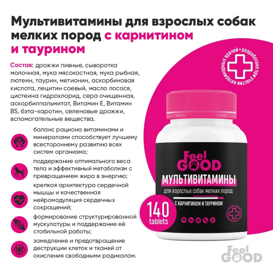 Мультивитамины для взрослых собак мелких пород FeelGOOD — это сбалансированная формула эссенциальных витаминов, микро- и макроэлементов для жизнерадостной собаки. Мультивитаминный комплекс усилен аминокислотами L-Карнитином и L-Таурином. Карнитин необходим для оптимальной работы сердца, головного мозга и мускулатуры. Таурин участвует в нейромодуляции зрения, поддерживает мышечную активность, сердечную работу, иммунный ответ, участвует в синтезе желчных кислот для эмульгирования липидов, является мощным антиоксидантом и принимает участие в связывании и выведении искусственных синтетических соединений из организма. Положительные эффекты на здоровье домашних животных при ежедневном употреблении пивных дрожжей FeelGOOD: баланс рациона витаминами и минералами способствует лучшему всестороннему развитию всех систем организма; поддержание оптимального веса тела и эффективный метаболизм с превращением жира в энергию; крепкая архитектура сердечной мышцы и качественная нейромодуляция сердечных сокращений; формиро