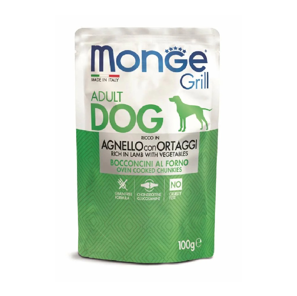 Monge Grill AGNELLO CON ORTAGGI - влажный корм с ягненком и овощами для взрослых собак всех пород. Это сочные кусочки свежайшего мяса, приготовленного на гриле.