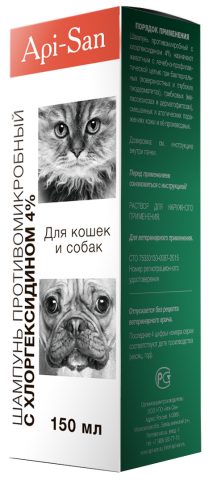 Шампунь противомикробный с хлоргексидином 4% назначают собакам и кошкам с лечебной и профилактической целью при бактериальных (поверхностных и глубоких пиодерматитах), грибковых (малацезиозах и дерматофитозах), смешанных и атопических поражениях кожи и её производных.