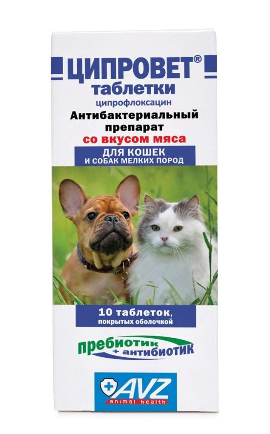 Ципровет — это антибактериальный препарат группы фторхинолонов. Назначают собакам и кошкам с лечебной целью при хронических и острых бактериальных инфекциях желудочно-кишечного тракта, желчных путей, органов дыхания, мочеполовой системы, кожи и мягких тканей, костей и суставов, а также при вторичных инфекциях на фоне вирусных заболеваний, возбудители которых чувствительны к ципрофлоксацину.
