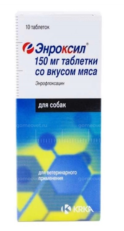 Энроксил таблетки со вкусом мяса для собак (международное непатентованное наименование: энрофлоксацин) в одной таблетке содержит 150 мг энрофлоксацина и вспомогательные компоненты: маннитол, кукурузный крахмал, крахмала гликолят натрия, сополимер метакриловой кислоты, лаурилсульфат натрия, дебутилсебацинат, кроскармеллозу натрия, коллоидный диоксид кремния, тальк, стеарат м