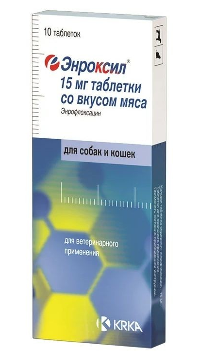 Энроксил таблетки со вкусом мяса для собак (международное непатентованное наименование: энрофлоксацин) в одной таблетке содержит 15 мг энрофлоксацина и вспомогательные компоненты: маннитол, кукурузный крахмал, крахмала гликолят натрия, сополимер метакриловой кислоты, лаурилсульфат натрия, дебутилсебацинат, кроскармеллозу натрия, коллоидный диоксид кремния, тальк, стеарат маг