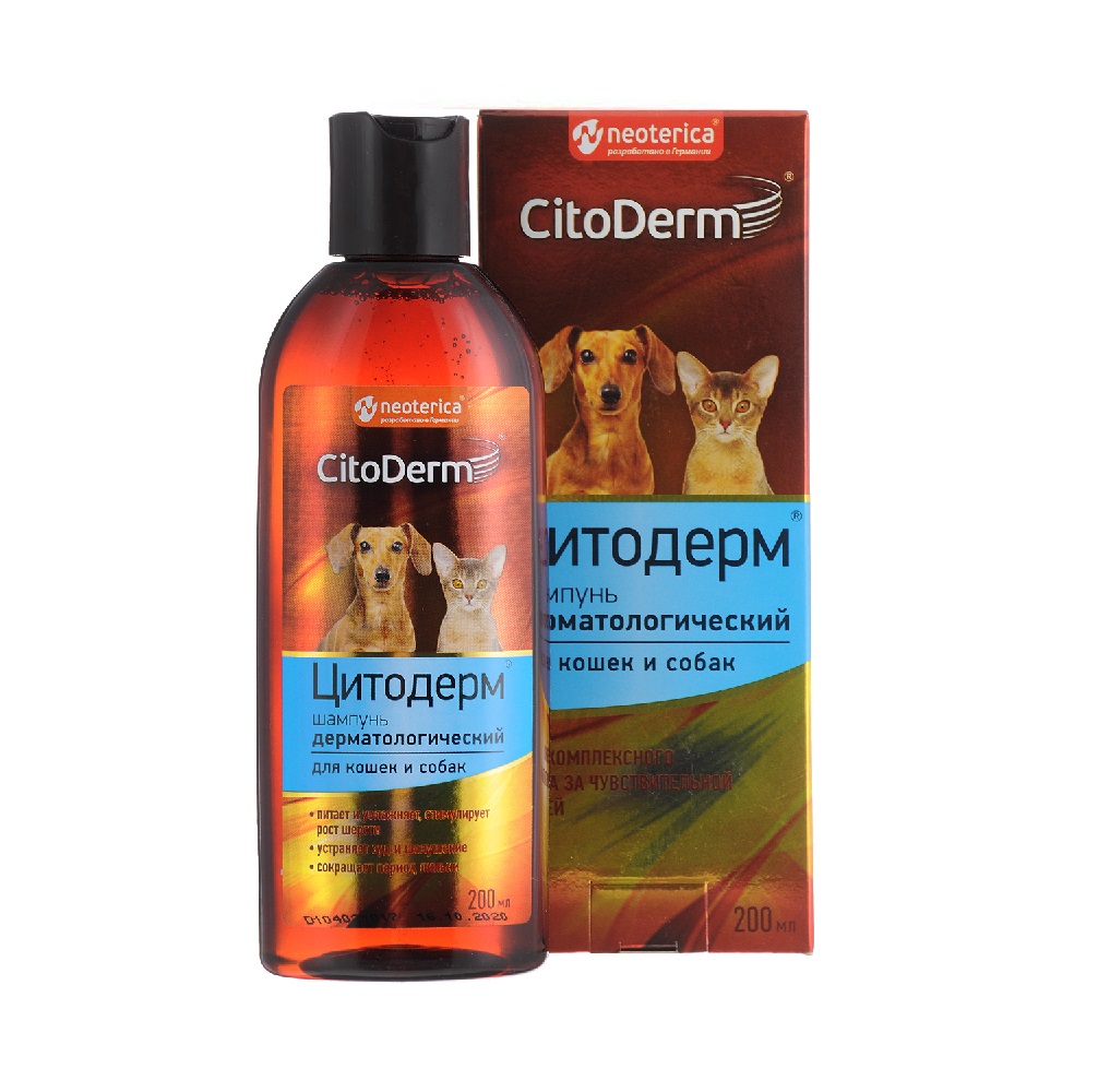 CitoDerm шампунь дерматологический – косметико-гигиеническое средство для ухода за кожей и шерстью животных, склонных к дерматитам.