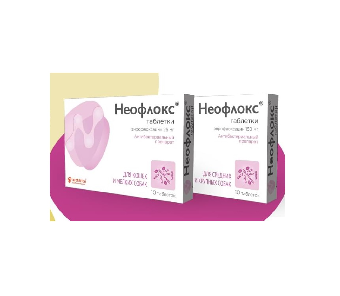 Неофлокс таблетки применяют для лечения собак и кошек при заболеваниях органов дыхания, желудочно-кишечного тракта и мочеполовой системы, инфекций мягких тканей и отитов, инфицированных ран и других заболеваний бактериальной и микоплазменной этиологии, возбудители которых чувствительны к энрофлоксацину.