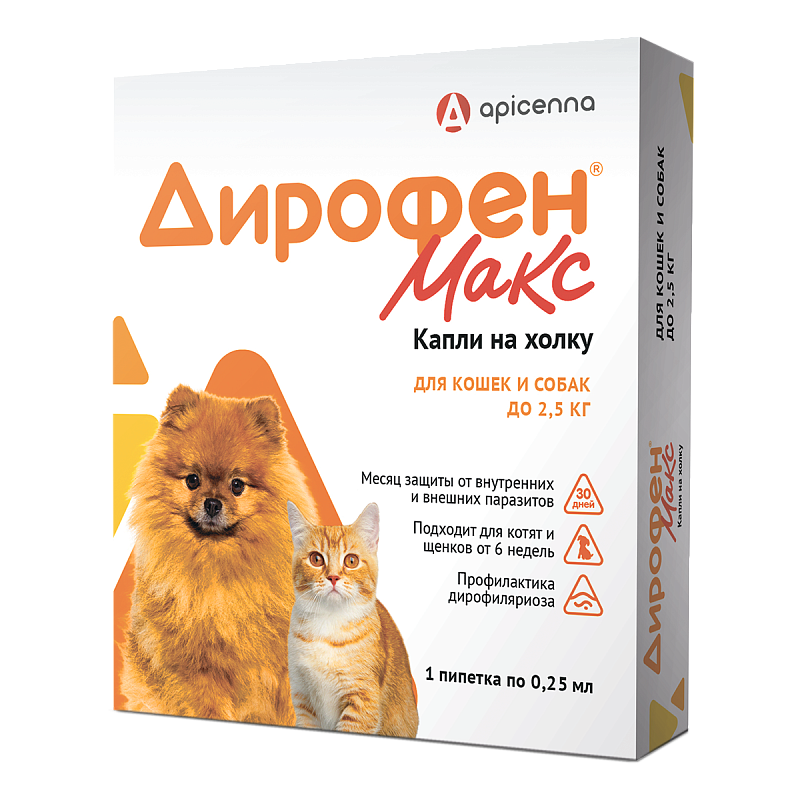 Apicenna Дирофен Max 60мг (д/кошек и собак до 2,5кг), 1 пипетка по 0,25мл