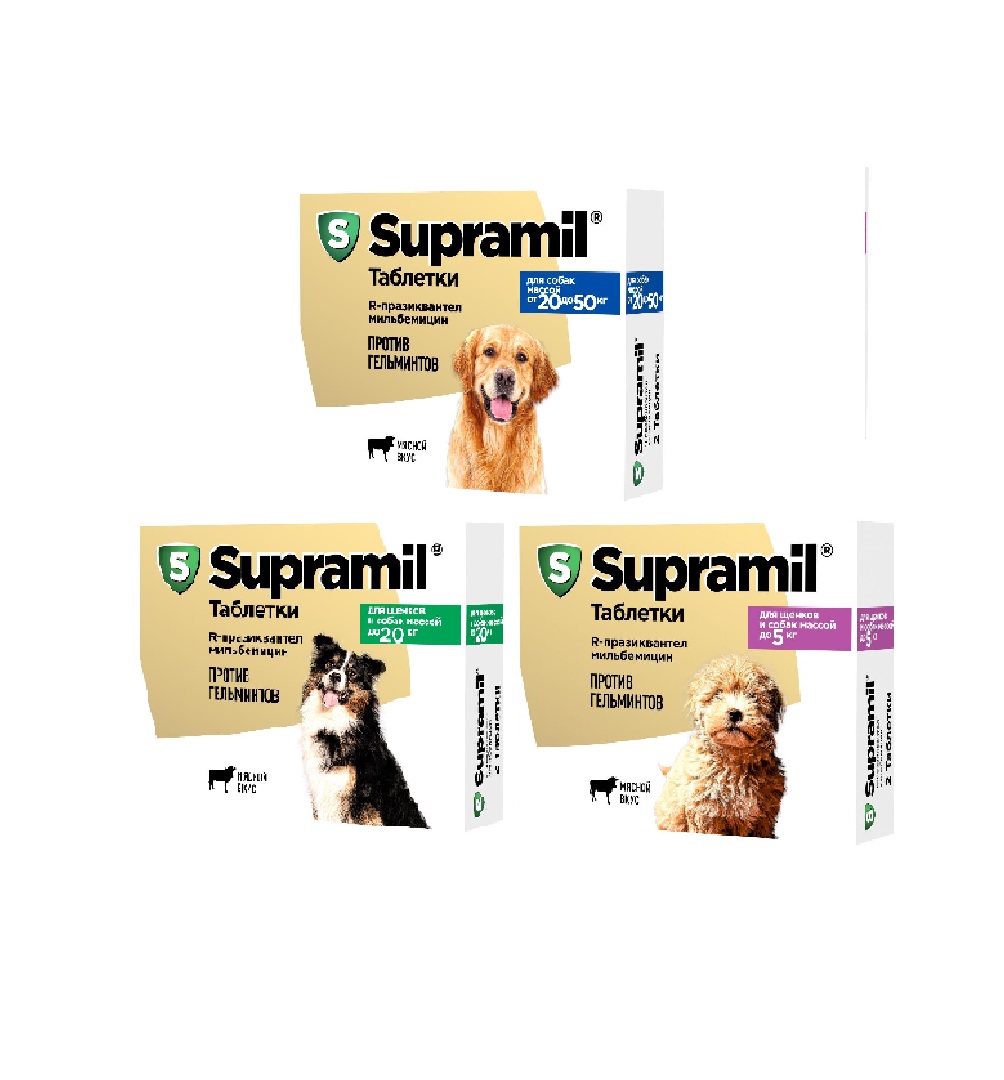Supramil таблетки назначают взрослым собакам и щенкам с лечебной и профилактической целью при кишечных нематодозах, цестодозах и смешанных инвазиях. Дегельминтизацию беременных и кормящих самок рекомендуется проводить под наблюдением ветеринарного врача.