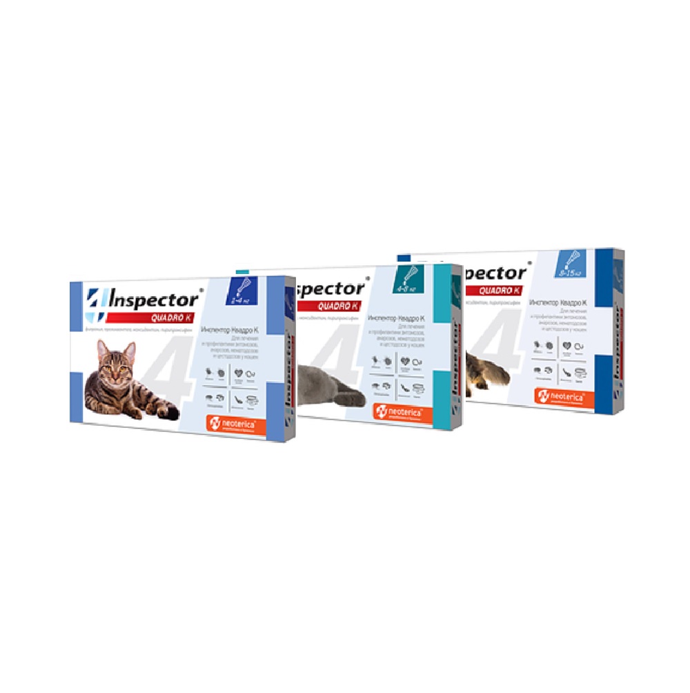 Инспектор Квадро К назначают кошкам для лечения и профилактики энтомозов, отодектоза, нотоэдроза, акарозов, вызываемых иксодовыми клещами, нематодозов желудочно-кишечного тракта (токсокароз, токсаскаридоз, унцинариоз, анкилостомоз), цестодозах (тениидозы, дипилидиозе, мезоцестоидозах, дифиллоботриозах), а также в целях профилактики дирофиляриоза.