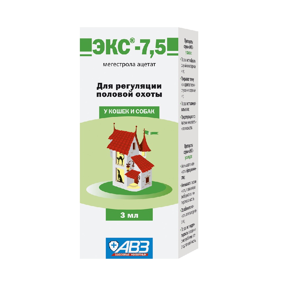 ЭКС-7,5 в 1 мл содержит мегестрола ацетат – 30 мг. ЭКС-5Т в 1 таблетке массой 0,05 г содержит мегестрола ацетата – 5 мг.