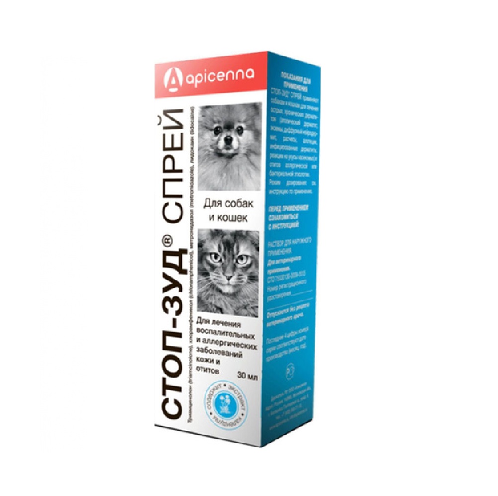 Стоп-зуд спрей — комплексный противовоспалительный препарат для лечения кожных заболеваний у животных (Международное непатентованное наименование: полькортолон или триамцинолон + левомицетин или хлорамфеникол + метронидазол + лидокаина гидрохлорид). В 1 мл препарата содержится: 0,5 мг полькортолона, 5 мг левомицетина, 1 мг метронидазола, 50 мг лидокаина гидрохлорида, экстракт календулы, диметилсульфоксид и вспомогательные компоненты. По внешнему виду представляет собой прозрачную, слегка опалесцирующую жидкость светло-желтого цвета, со слабым специфическим запахом. Расфасовывают по 30 мл в полимерные флаконы с распылителем, которые упаковывают в картонные коробки. ФАРМАКОЛОГИЧЕСКИЕ СВОЙСТВА Стоп-зуд спрей — препарат комплексного воздействия на поврежденную и воспаленную кожу: устраняет боль, снимает зуд, отек и раздражение, эффективно борется с патогенными и условно патогенными микробами на коже. Полькортолон является синтетиче
