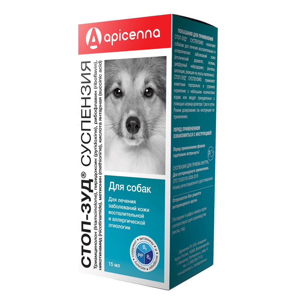 Стоп-зуд суспензия — комплексный противовоспалительный препарат для лечения кожных заболеваний животных (Международное непатентованное наименование: полькортолон или триамцинолон + пиридоксин гидрохлорид + рибофлавин + никотинамид + метионин). В 1 мл суспензии содержится: 1 мг полькортолона, 2 мг пиридоксина гидрохлорида (витамина B6), 4 мг рибофлавина (витамина В2), 10 мг никотинамида (витамина PP), 20 мг метионина, а также янтарная кислота и вспомогательные компоненты. По внешнему виду представляет собой суспензию от ярко желтого до оранжевого цвета для применения внутрь. Расфасовывают по 10 и 15 мл в полимерные флаконы, которые упаковывают в картонные коробки вместе со шприцем-дозатором.
