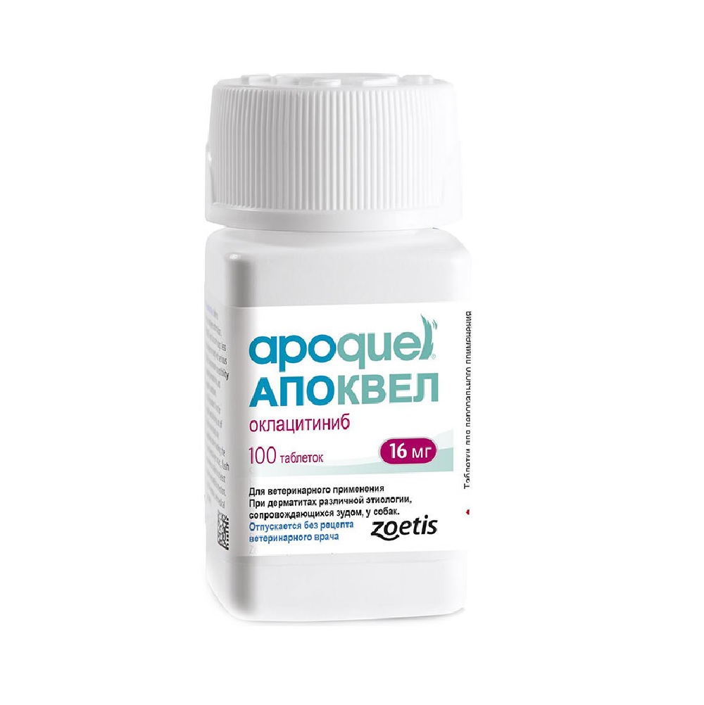 Апоквел выпускают в трех дозировках, содержащих в 1 таблетке в качестве действующего вещества оклацитиниба малеат (в пересчете на оклацитиниб) 3,6 мг; 5,4 мг и 16 мг соответственно, а также вспомогательные вещества: микрокристаллическую целлюлозу, лактозы моногидрат, карбоксиметил-крахмал натрия, магния стеарат, плёнкообразователь "Opadry II White" и воду очищенную.