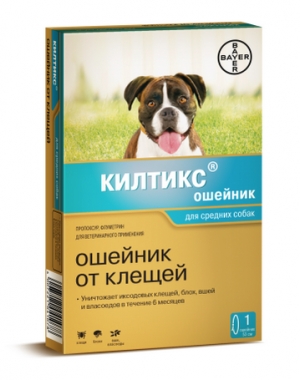 СОСТАВ И ФОРМА ВЫПУСКА Средство борьбы с эктопаразитами собак представляет собой поливиниловую ленту желтого цвета, содержащую в качестве действующих веществ пропоксур и флуметрин. Выпускают ошейник Килтикс для собак средних пород длиной 48 см, в герметично закрытых полиэтиленовых пакетах, помещенных в картонные коробки.